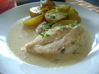 Krydda kycklingfiléerna med salt och peppar. Bryn dem i smör-& rapsolja i en stekpanna på båda sidor (går så klart bra med olja eller smör också). Vispa samman vatten, grädde, smulad buljongtärning, senap, timjan och vetemjöl. Häll det i pannan. Koka kycklingen i såsen under lock, ca 10 min. Strö ev över färsk timjan. Servera med ugnspotatis, kokt ris eller bulgur och grönsaker.